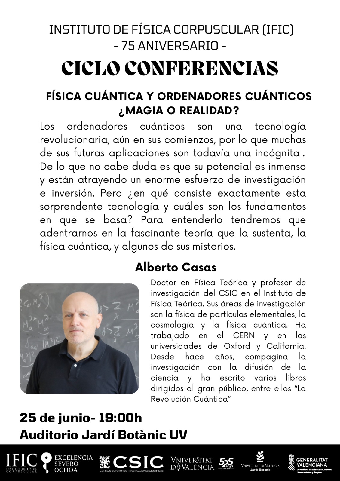 Miércoles, 25 de junio, 19:00 horas: ‘‘FÍSICA CUÁNTICA Y ORDENADORES CUÁNTICOS, ¿MAGIA O REALIDAD?", ponencia impartida por Alberto Casas.